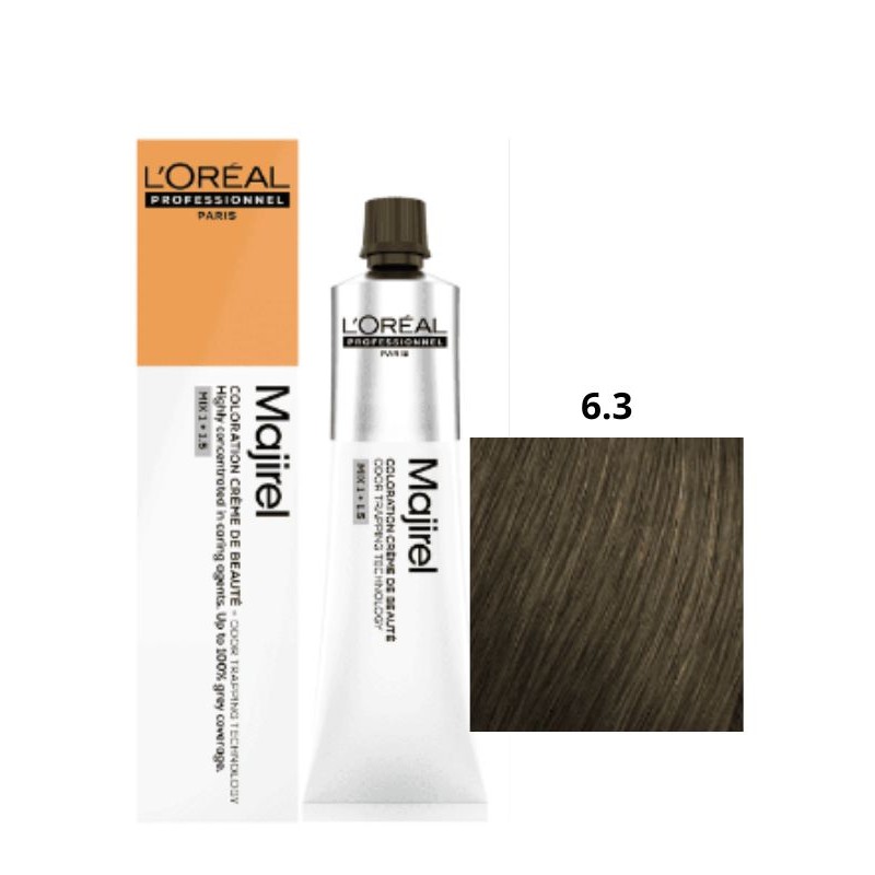 La Coloración Majirel 6.3 de L’Oréal Professionnel es un rubio oscuro dorado, ideal para conseguir tonos cálidos, naturales y equilibrados con una profundidad de color uniforme.
