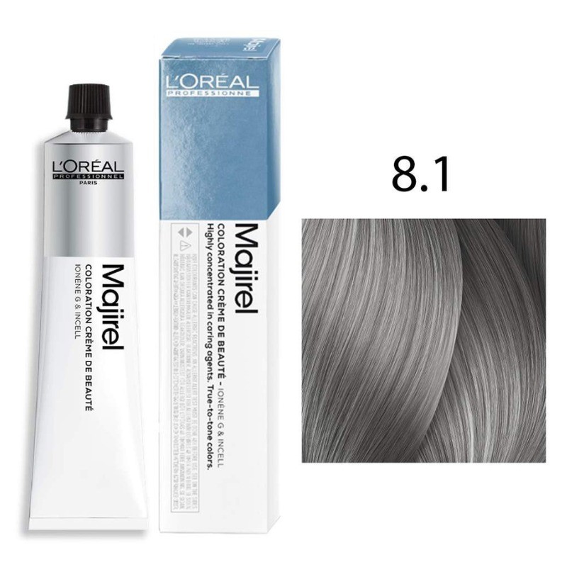 Coloración profesional Majirel 8.1 rubio claro ceniza. Neutraliza reflejos cálidos y aporta un color frío, uniforme y luminoso. Tubo de 60 ml. Uso profesional.