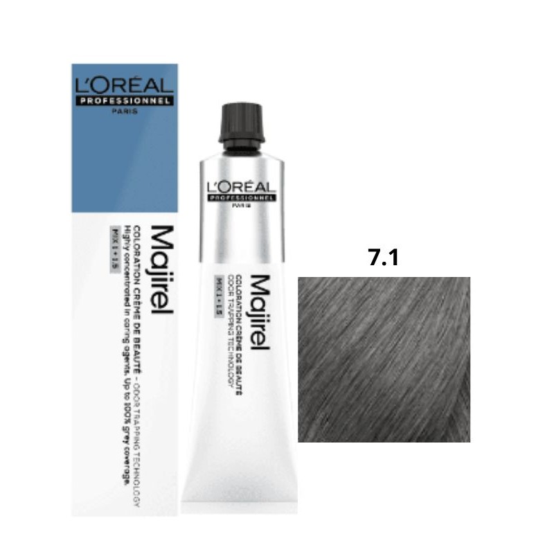 Coloración profesional Majirel 7.1 rubio ceniza. Neutraliza reflejos cálidos y aporta un color frío, natural y equilibrado. Tubo de 60 ml. Uso profesional.