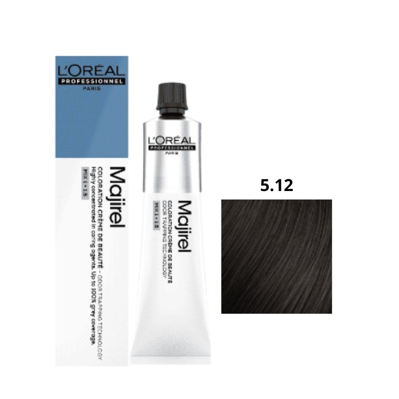 Coloración profesional Majirel 5.12 castaño claro ceniza irisado. Aporta equilibrio tonal, neutralización de reflejos cálidos y un color uniforme. Tubo de 60 ml. Uso profesional.
